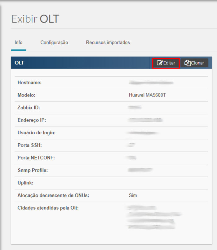 Mostrar código fonteRevisões anterioresVoltar ao topo Share via Share via... Twitter LinkedIn Facebook Pinterest Telegram WhatsApp Yammer Reddit TeamsAlterações recentesSend via e-MailPrintPermalink × Essa é uma revisão anterior do documento! Adicionar Cidades Vamos acessar Infra GPON → OLTs. Selecione a OLT desejada. Clique em Editar. Preencha o campo como na figura. Obs: Muito importante colocar a cidade com os acentos e sem os acentos. autoisp/adicionar_cidades.1662732039.txt.gz Última modificação: 2022/09/09 14:00por gustavo