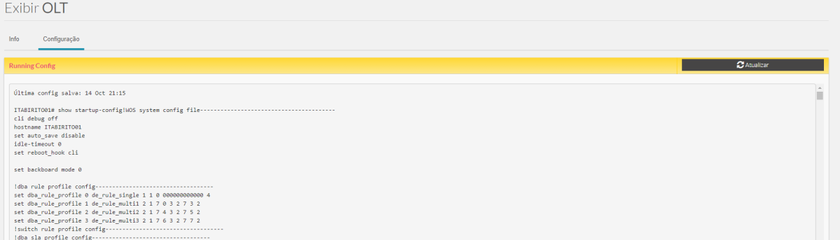 - Para verificar se o acesso do Portal a OLT está OK basta acessa-lá na aba OLT ir na aba configuração e clicar no botão “Atualizar”. Caso o acesso esteja OK a Running Config da OLT deverá aparecer abaixo.