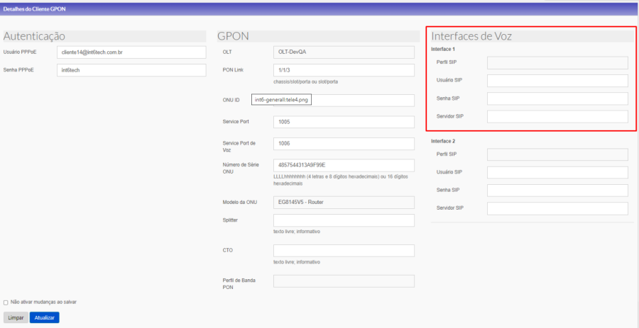 Em Intefaces de Voz atribuímos o Perfil SIP cadastrado anteriormente, o Usuário SIP, a Senha SIP e o Servidor SIP e clicamos em “Atualizar”.