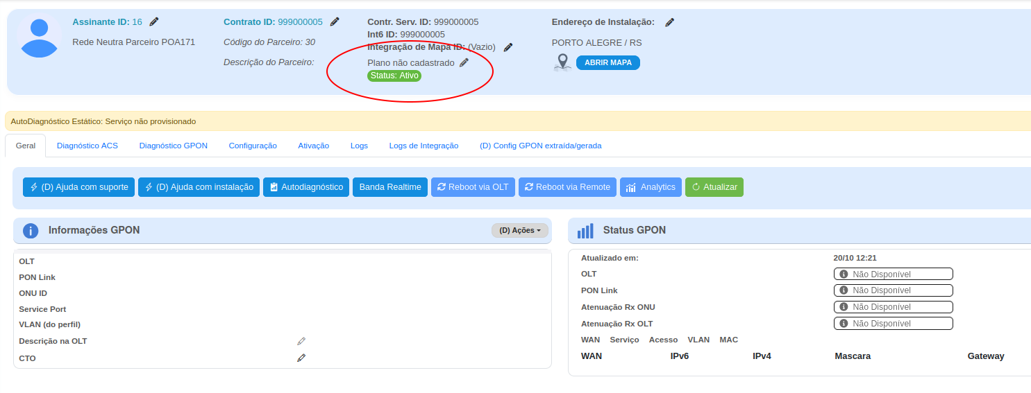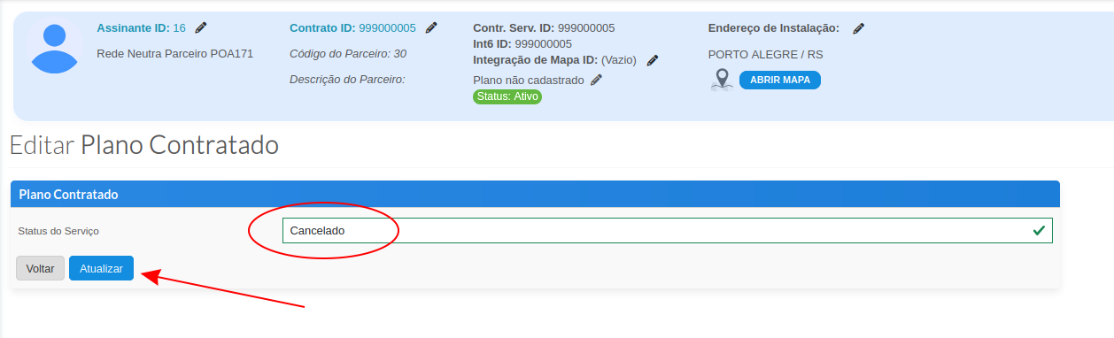 Com as devidas permissões de manipulação de contratos, um usuário do parceiro pode acessar um determinado contrato e cancelar manualmente através das telas abaixo.
